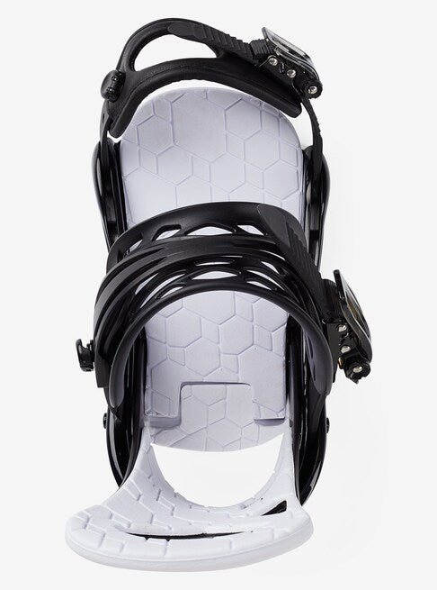 Hammockstrap ankle strap is ultra-responsive with a stitch-less construction and minimal materials, featuring a nylon cross spine for a more direct board connection; Supergrip Capstrap toe strap wraps over the toebox of the boot and is fully injected to reduce waste