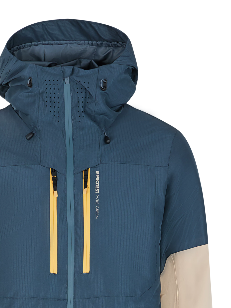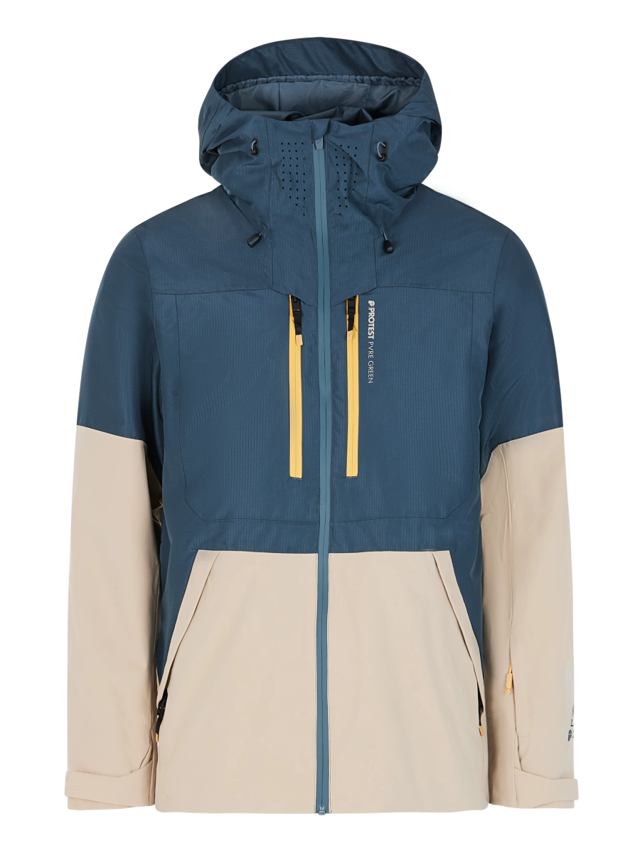 The PRTBAKIE ski and snowboard jacket by Protest combines style and practicality with an eco-friendly design. Part of our PVRE Green series, the PRTBAKIE is made of recycled materials and is free of harmful PFCs. The PRTBAKIE has plenty of useful design features, such as the helmet-compatible fixed hood with high collar, goggle pocket, waist gaiter and lift pass pocket. The 20g breathability and 20K water-repellent finish let excess moisture out while shielding you from moisture from the environment. Full taping, ventilation zips under the armpit and water-repellent front zips? Check! The Lycra inner cuffs with thumb hole are practical while on the slopes. The contrasting zips and Protest logo complete the look. The PRTBAKIE is available in a slim fit and length.